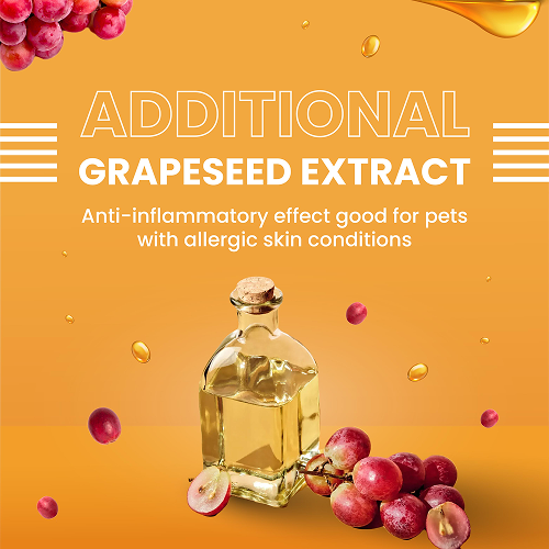 TURMERIC, PUMKIN & GRAPE SEED: Bioactive Curcumin (turmeric) reduces free radical damage at the skin level and hydrates it leaving the coat glowing and shiny. Pumpkin is packed with antioxidants and Vitamin A that boosts collagen production to improve skin tone. Grape seed extract maintains skin health and elasticity.