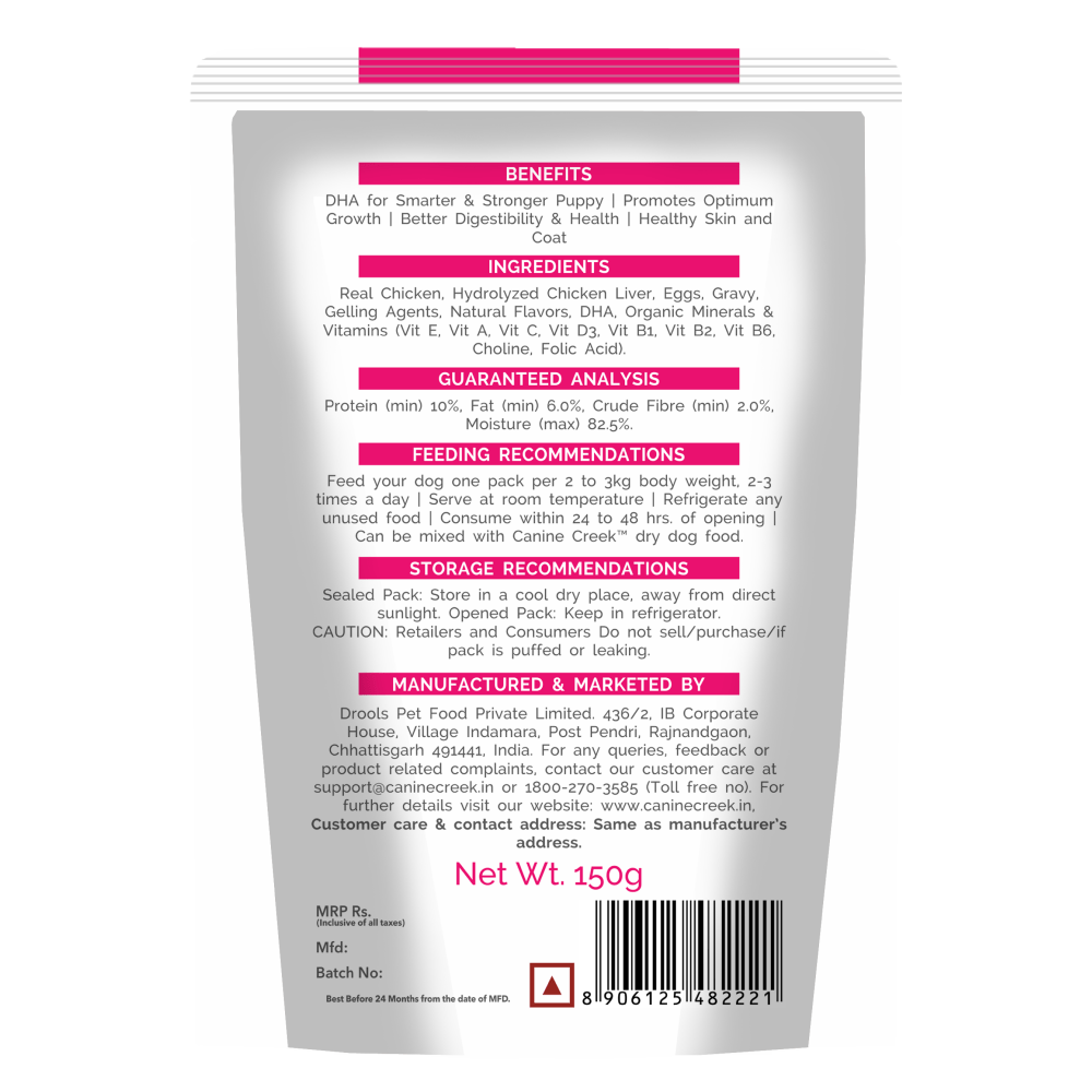 Give your puppy the best start with Canine Creek Real Chicken Gravy Puppy Wet Food – a tasty and nutritious meal made with real chicken in rich, savory gravy. Specially formulated to meet the unique nutritional needs of growing puppies, this premium wet food supports healthy development, strong immunity, and boundless energy.
