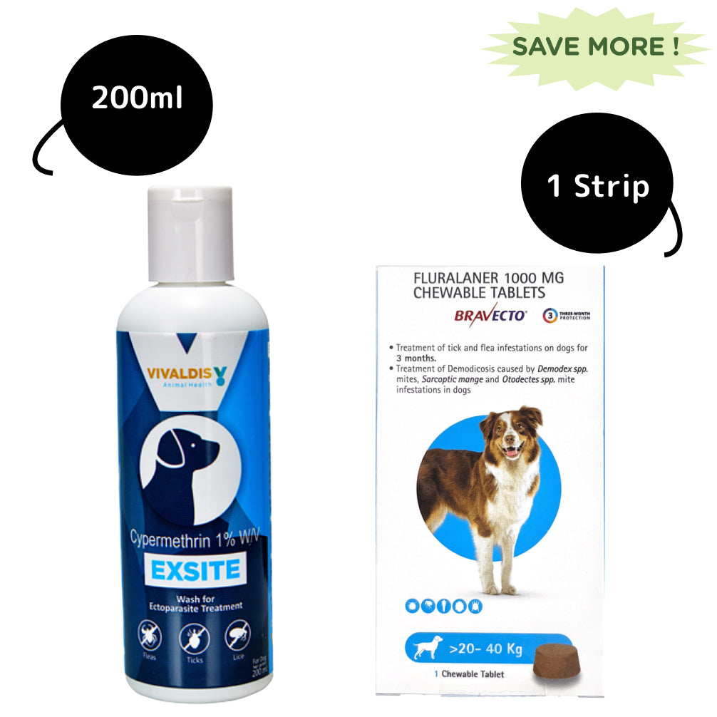 MSD Animal Health Bravecto Tablet (20-40 kg) and Vivaldis Exsite Dog Shampoo Tick & flea Control Combo