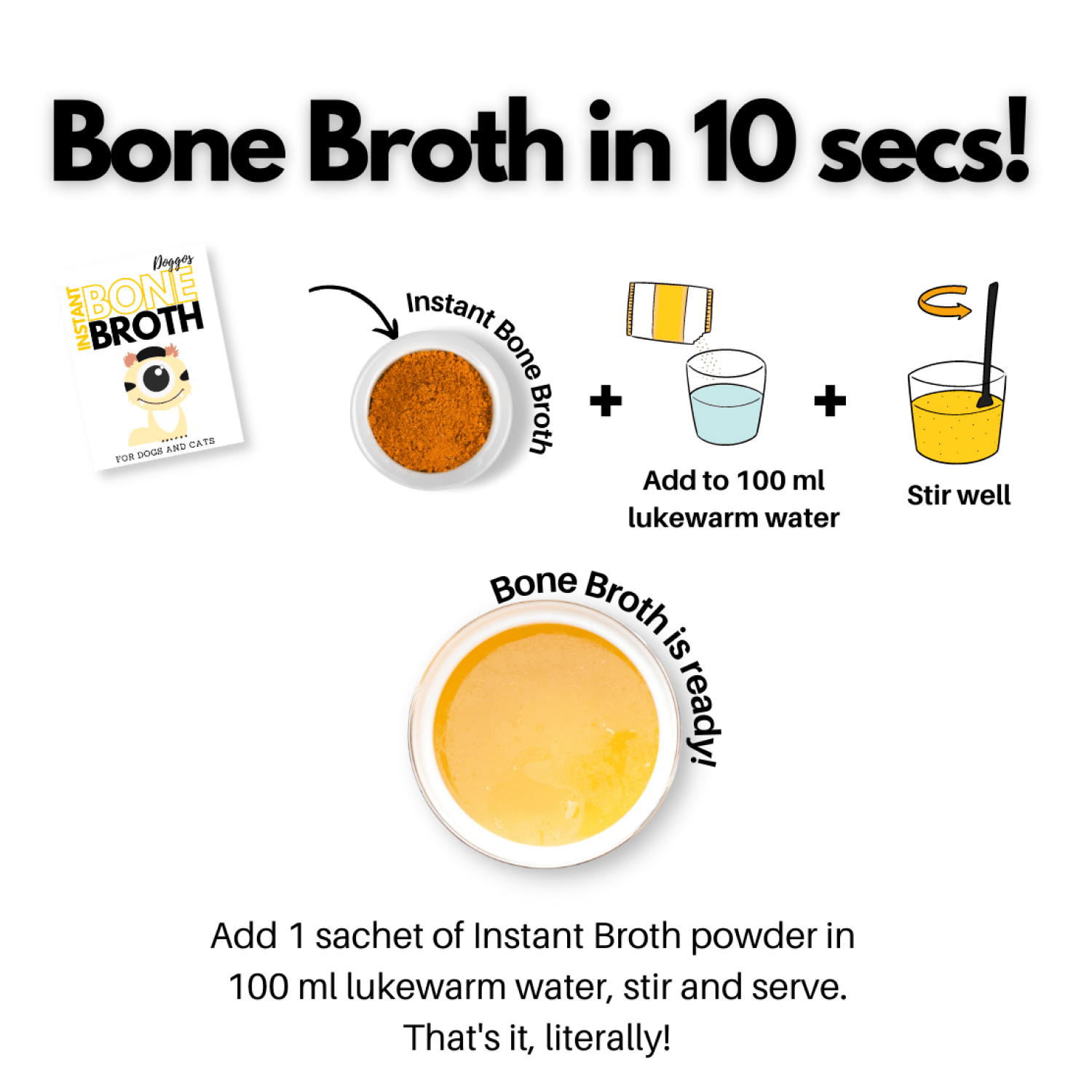 - Our Instant Bone Broth comes in a sachet of 3.5 grams, which makes 100ml of Bone Broth.