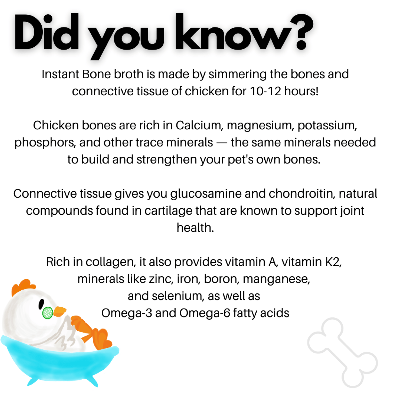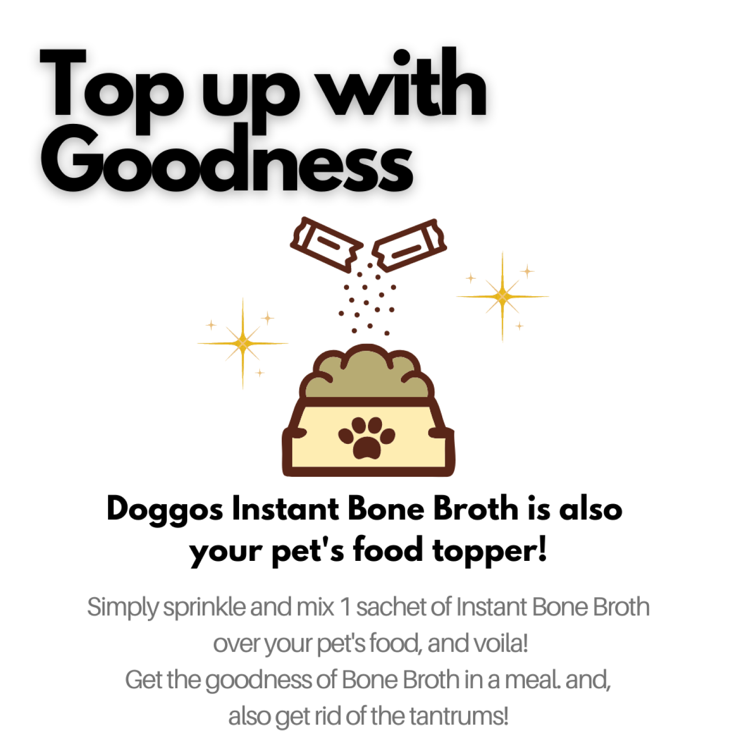 - Simply sprinkle or pour the 100ml of broth on your pet's kibbles, and get goodness of chicken bone broth in a meal.
