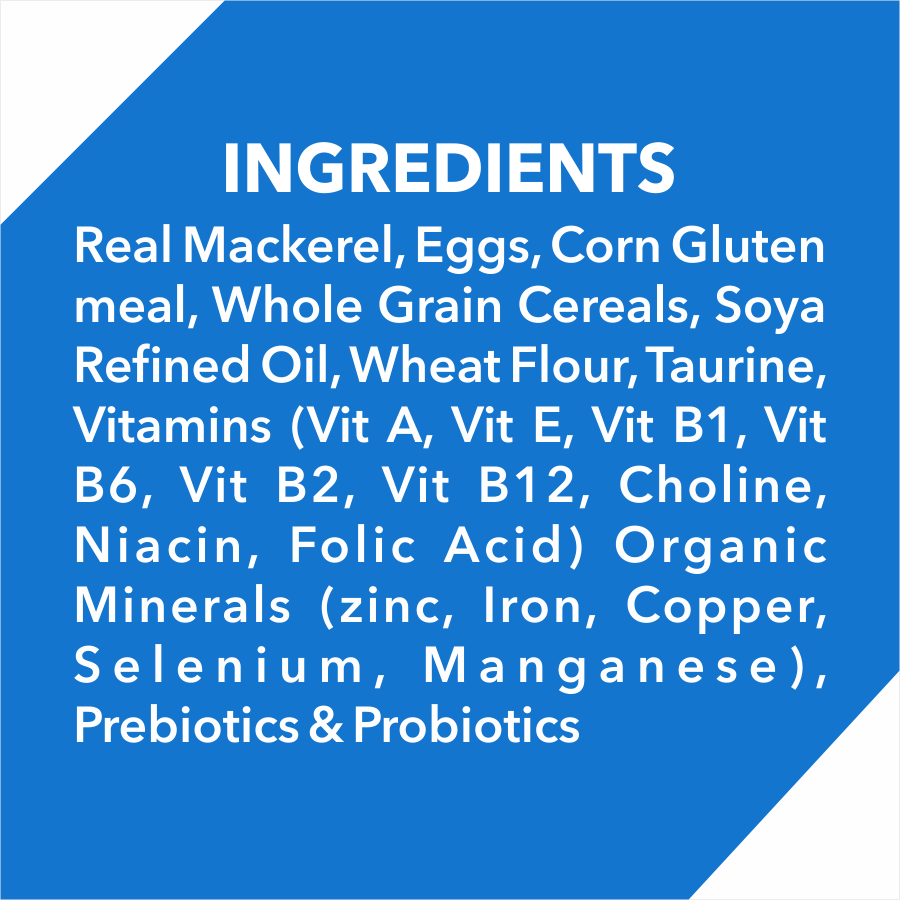 Drools Adult Cat Dry Food is designed to support cat's vital functions. It provides better vision, a healthy and shiny coat. This complete and balanced meal provides the essential vitamins and minerals which makes cat healthy. Prebiotics (Natural Herbs) protect cats from hairball formation and Probiotics keep their digestive system healthy. Omega 3 & 6 fatty acids keep the coat beautiful and lustrous.