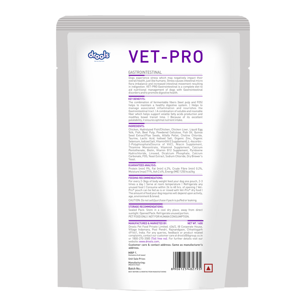 Support your dog’s digestive health with Drools VET PRO Gastro Pet Wet Food, a specially formulated diet for dogs with gastrointestinal sensitivities. Designed by veterinarians, this easily digestible wet food provides targeted nutrition to manage digestive issues, improve gut health, and promote nutrient absorption.