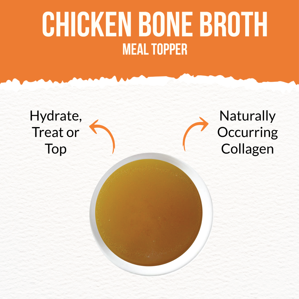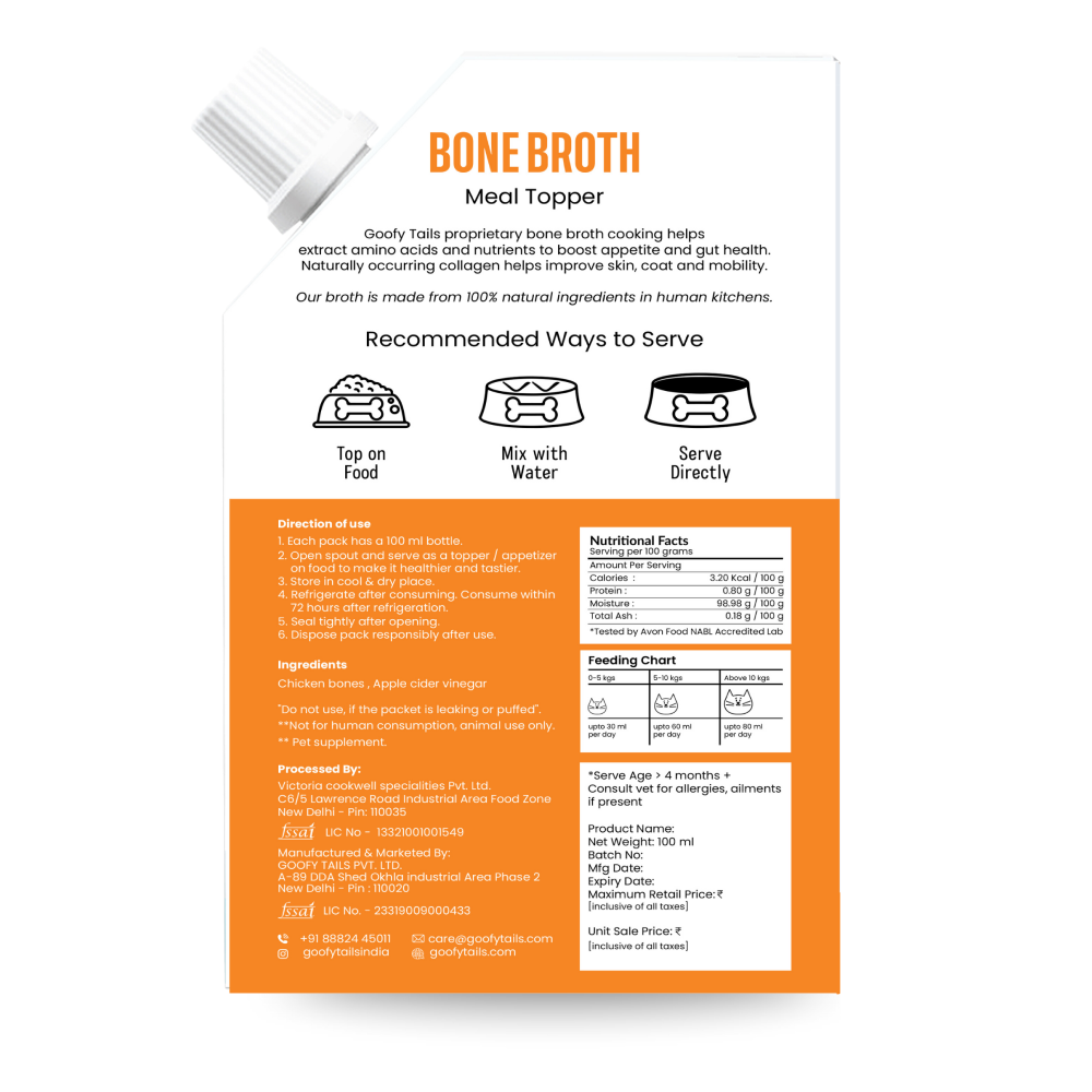 Satisfy your pet’s appetite with delicious chicken bone broth cay food toppers for dry food from Goofy Tails! This exclusive chicken bone broth is an easy, amazing way to transform any meal from ordinary to extraordinary - simply pour the broth over your cat’s next kibble, freeze-dried, or fresh meal, and watch them enjoy the satisfying difference a little bone broth can make. Featuring an exclusive formula, this food topper for cats is made with bones that have been cooked for hours to extract nourishing protein. These cat food gravy toppings for dry food are a natural source of collage that can help boost the quality of your pet’s coat and skin, support your pet’s joints and improve gut health. Your pet will love the delicious flavor of this gravy cat food - and you’ll love the healthy, nutritious benefits with every bite! At Goofy Tails, we know how important it is to make sure your pet eats only high-quality, nutritious food and treats that support their health. Our bone broths for cats are made with 100% human-grade ingredients, and they are made in a human food facility so you can ensure your pet only gets the best. This wholesome cat food broth will transform an ordinary meal into a culinary experience - and your pet will love every bite! Treat your best friend to unbeatable, delicious flavor with the Goofy Tails Bone Broth for cats.