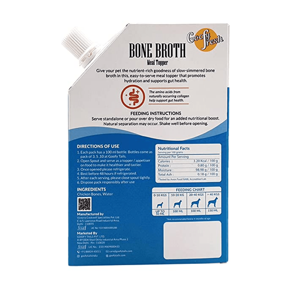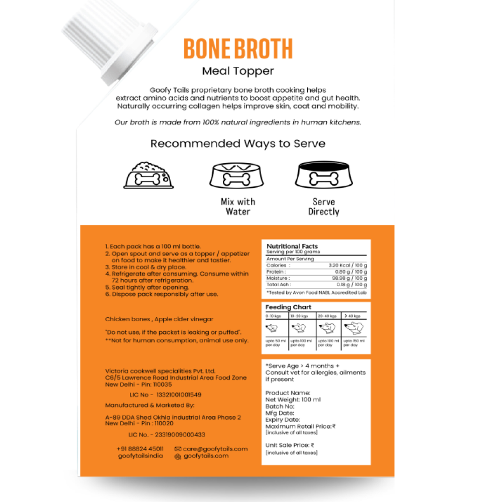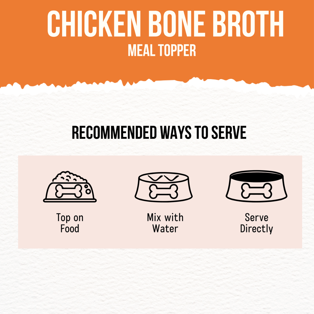 Satisfy your pet’s appetite with delicious chicken bone broth dog food toppers for dry food from Goofy Tails! Carefully formulated with exceptional ingredients to make sure every bite is delicious and healthy, our bone broth will get your pet excited about their next meal. This exclusive chicken bone broth is an easy, amazing way to transform any meal from ordinary to extraordinary - simply pour the broth over your dog’s next kibble, freeze-dried, or fresh meal, and watch them enjoy the satisfying difference a little bone broth can make. Featuring an exclusive formula, this food topper for dogs is made with the finest quality bones that have been cooked for hours to extract nourishing protein. These dog food gravy toppings for dry food are a natural source of collage that can help boost the quality of your pet’s coat and skin, and support your pet’s joints, and improve gut health. Your pet will love the delicious flavor of this gravy dog food - and you’ll love the healthy, nutritious benefits with every bite! At Goofy Tails, we know how important it is to make sure your pet eats only high-quality, nutritious food and treats that support their health. Our bone broths for dogs are made with 100% human-grade ingredients, and they are made in a human food facility so you can ensure your pet only gets the best. This wholesome dog food broth will transform an ordinary meal into a culinary experience - and your pet will love every bite! Treat your best friend to unbeatable, delicious flavor with the Goofy Tails Bone Broth for dogs. Product Details: (1) Pouch of Goofy Tails Bone Broth Size: 100ml Flavor: Chicken Bone Broth