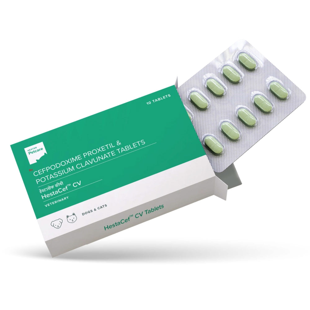 Hestacef CV 162.5 is a broad-spectrum antibiotic used for bacterial infections in dogs and cats. It contains Cefpodoxime Proxetil, a third-generation cephalosporin, combined with Clavulanic Acid, which enhances its effectiveness against beta-lactamase-producing bacteria. It is available in flavored tablets for easy administration.