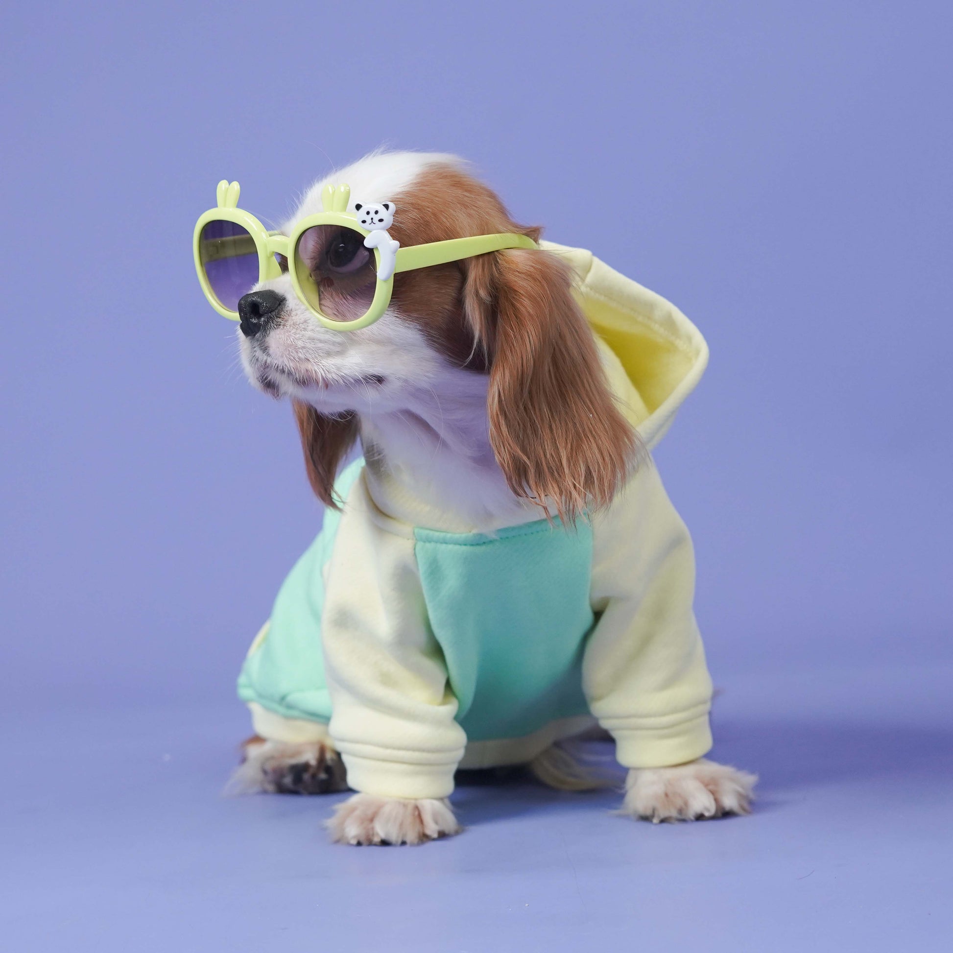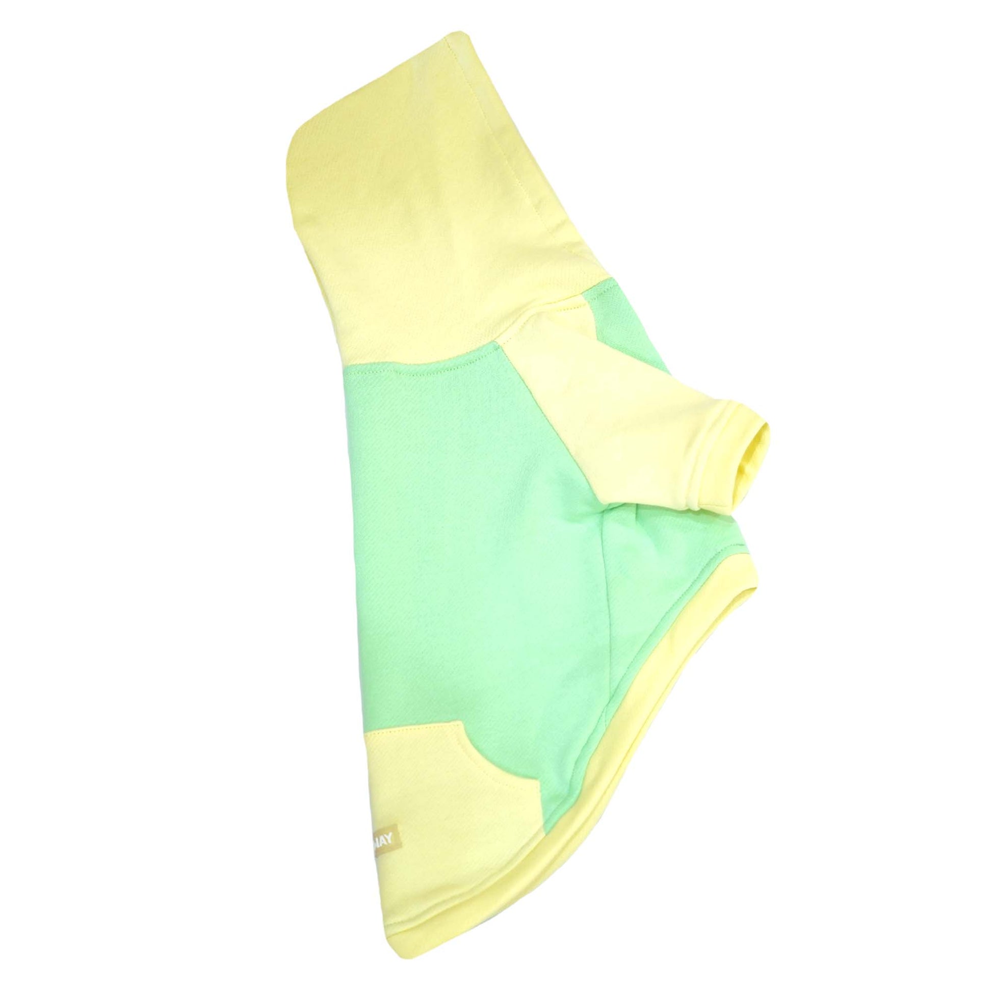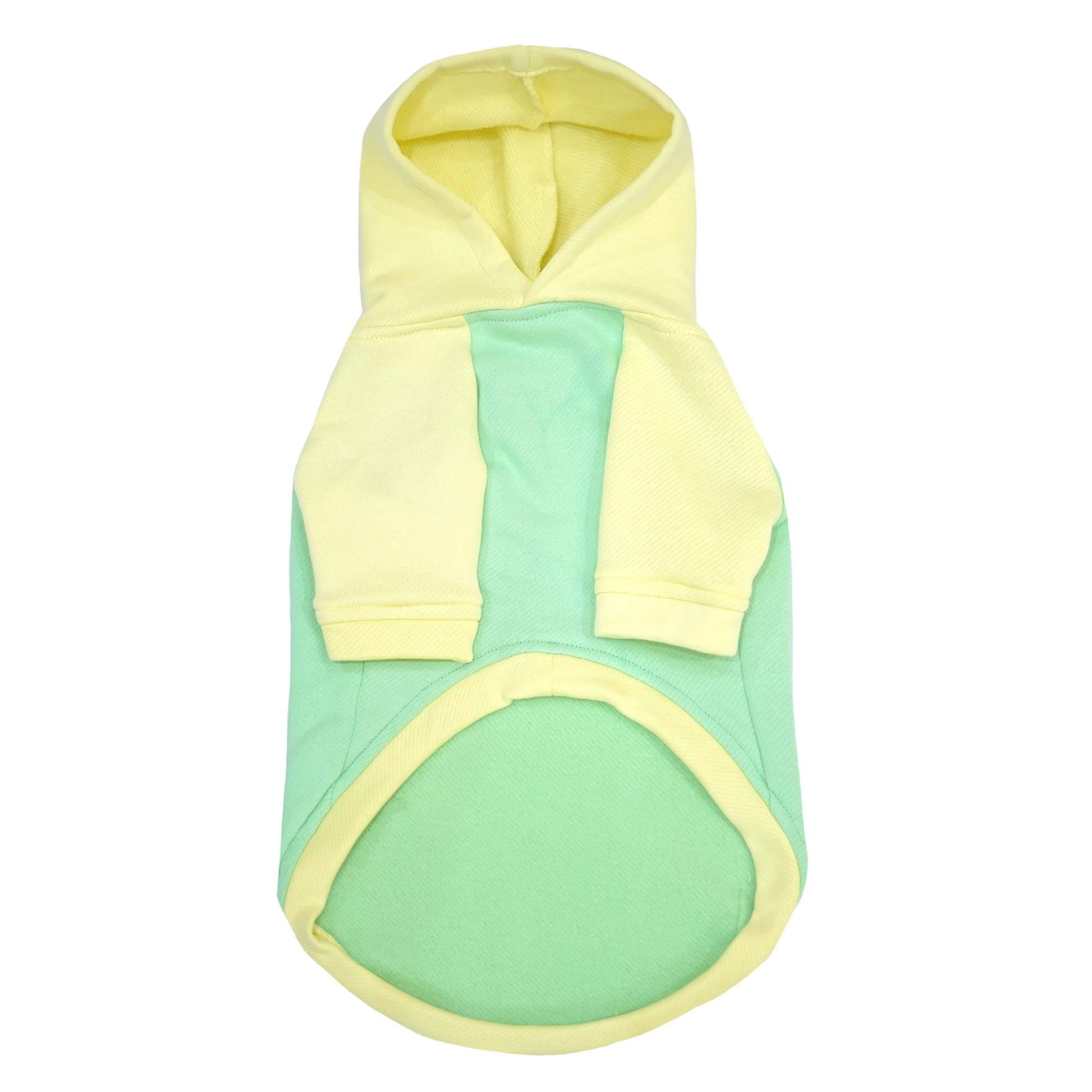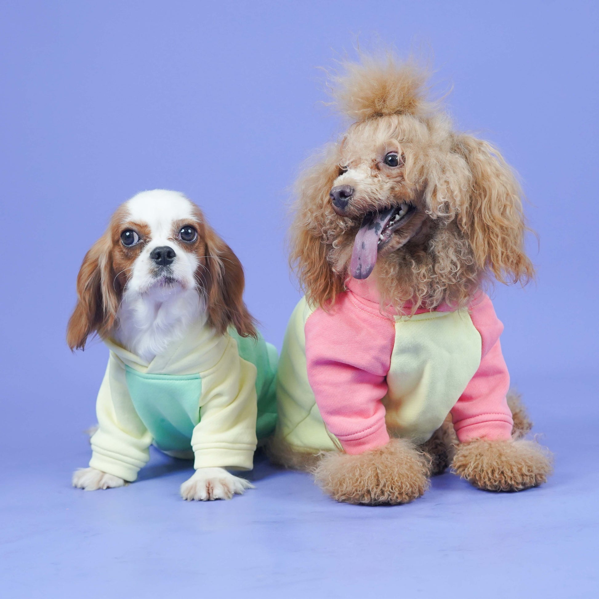 Chic Color Combo – Features a vibrant yellow body paired with cozy coral-colored sleeves and a matching hood, making it a standout piece for any pup.