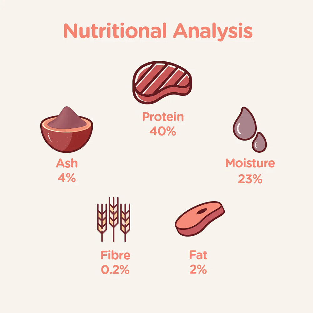 Nutritional Information: Protein 40%, Fat 2%, Ash 4%, Fibre 0.2 %, Moisture 23%