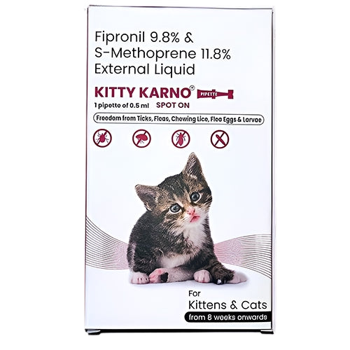 Protect your feline from fleas and ticks with Kitty Karno’s Spot-On Flea & Tick Control, specially formulated for kittens and cats aged 8 weeks and older. This easy-to-apply topical solution delivers fast and effective protection against external parasites, helping to prevent skin irritation, itching, and flea-borne diseases.