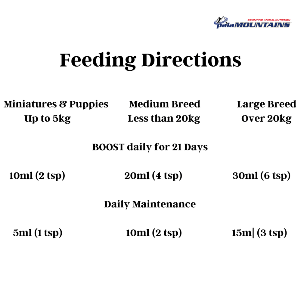 As a dietary supplement to increase vitamin intake, pour onto any type of dog food. For best results, use daily for 21 days to BOOST then daily as a maintenance application.