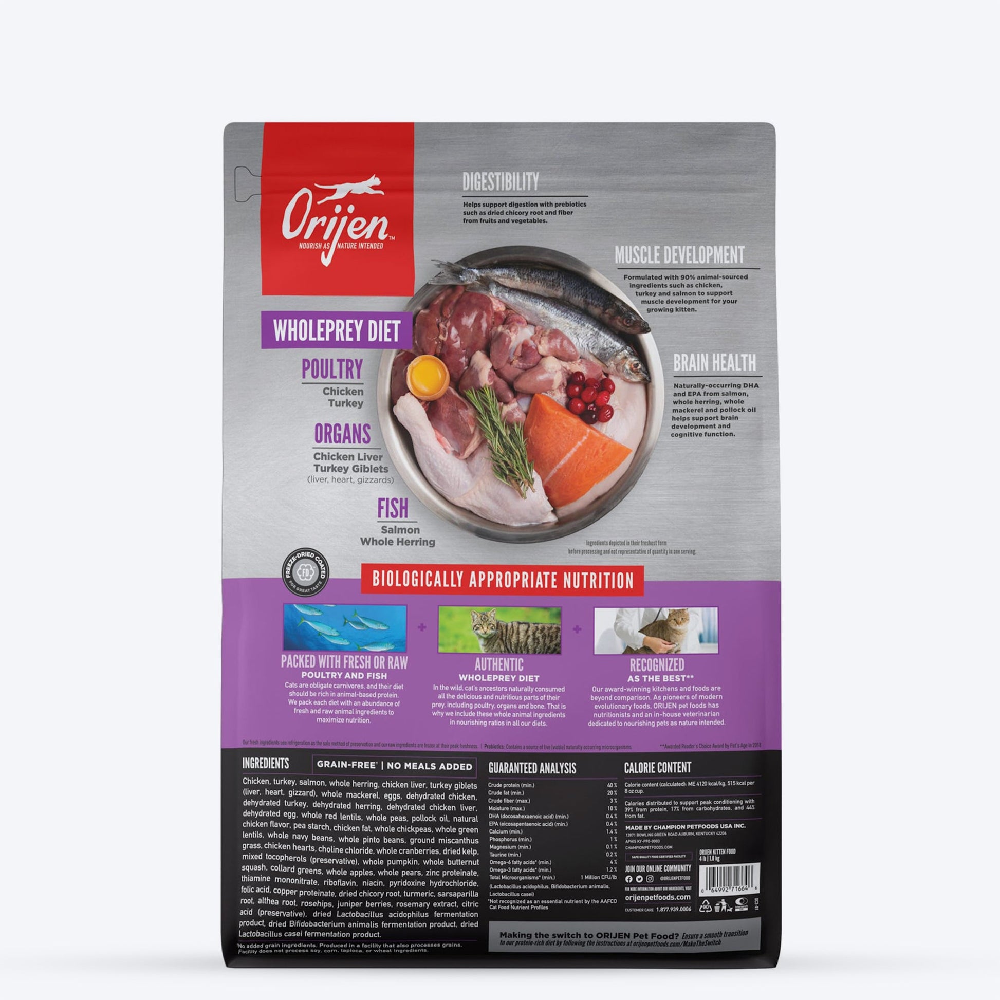 ORIJEN Kitten Food is formulated to meet the nutritional levels established by the AAFCO Cat Food Nutrient Profiles for Growth of Kittens.