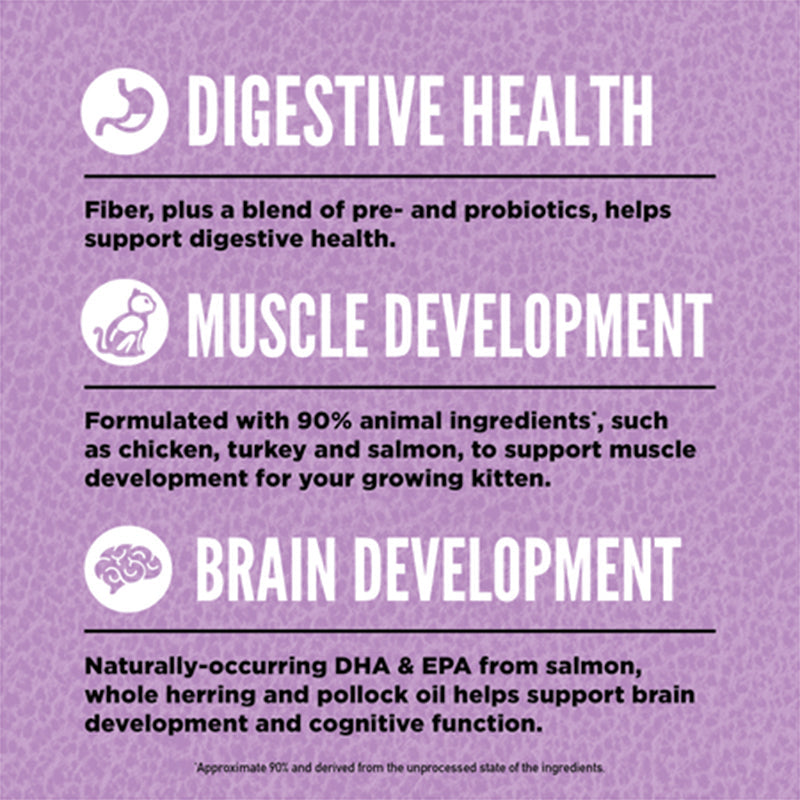 - Muscle Development: Formulated with 90% animal ingredients such as chicken, turkey and salmon to support muscle development for your growing kitten.