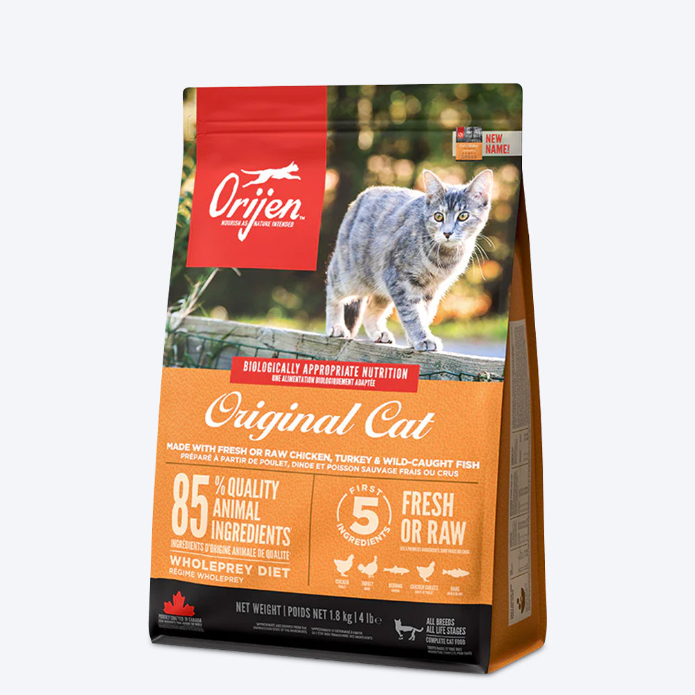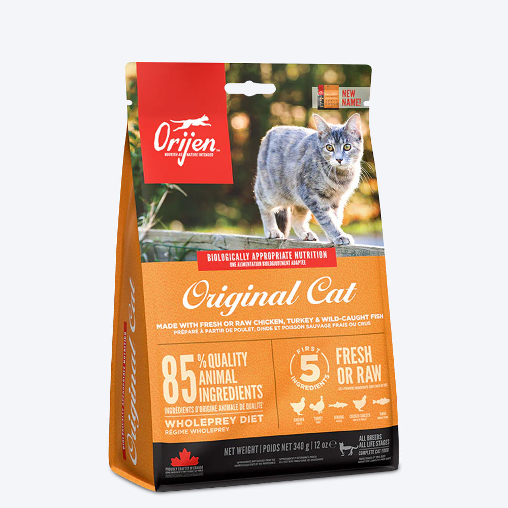 Help your cat thrive with the power of protein-rich recipes that provide peak nourishment. As obligate carnivores, modern cats are built like their ancestors and thrive on a Biologically Appropriate diet rich in protein and fat sourced from a variety of animal ingredients. ORIJEN Original Cat diet is made with fresh or raw free-run chicken and turkey, wild-caught fish and cage-free eggs. Packed with Whole Prey animal ingredients like organs and bone, ORIJEN food is made with the most nutrient-dense, succulent parts of the prey to deliver the nutrition cats need. With 90% quality animal ingredients and a freeze-dried liver coating, this diet is beyond comparison.