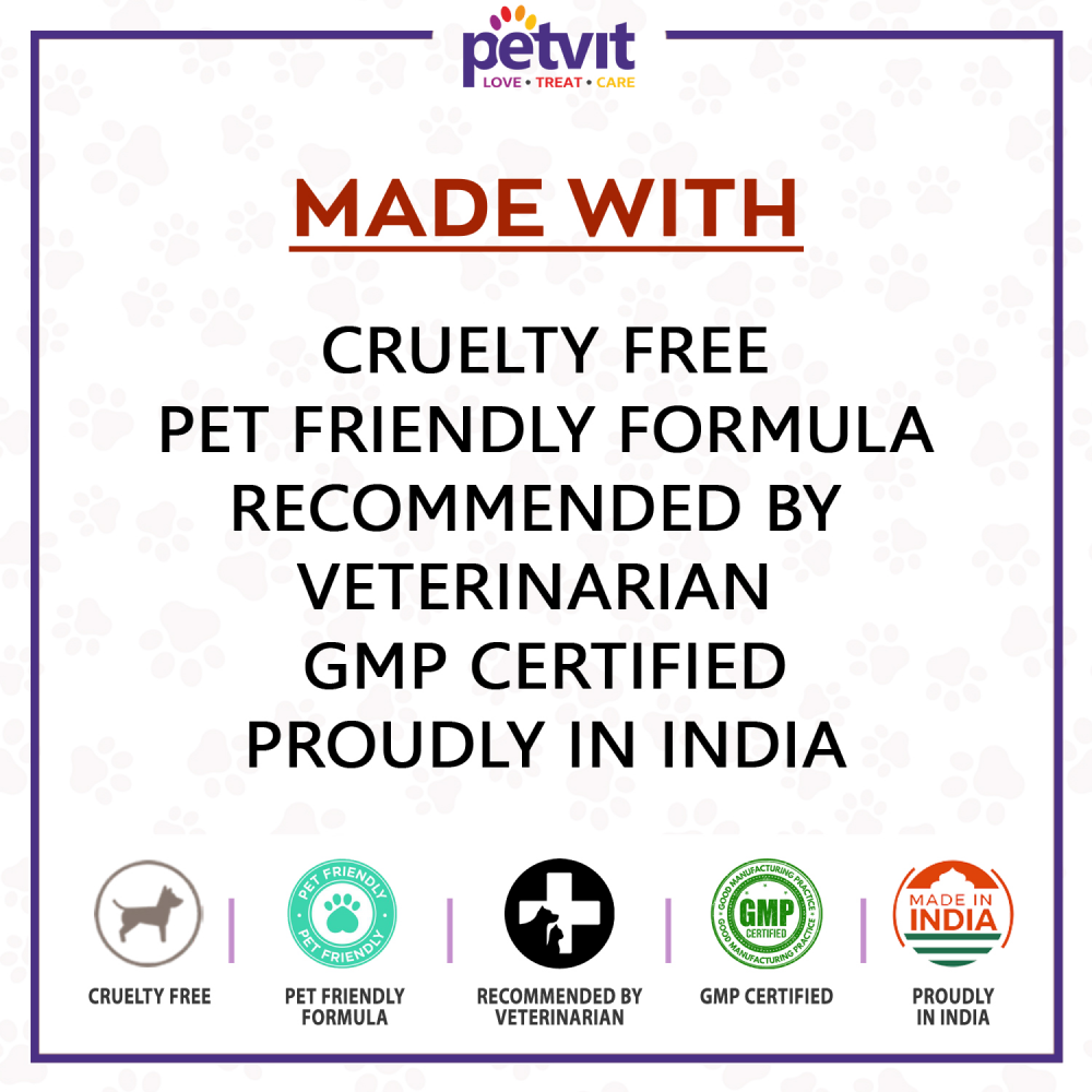 - Petvit is completely natural therefore if your pet licks the product on their skin after application it will not cause any harm. It also helps curb skin irritation to keep your pet calm.