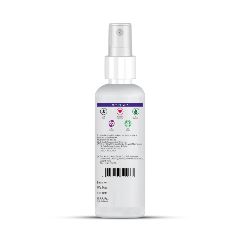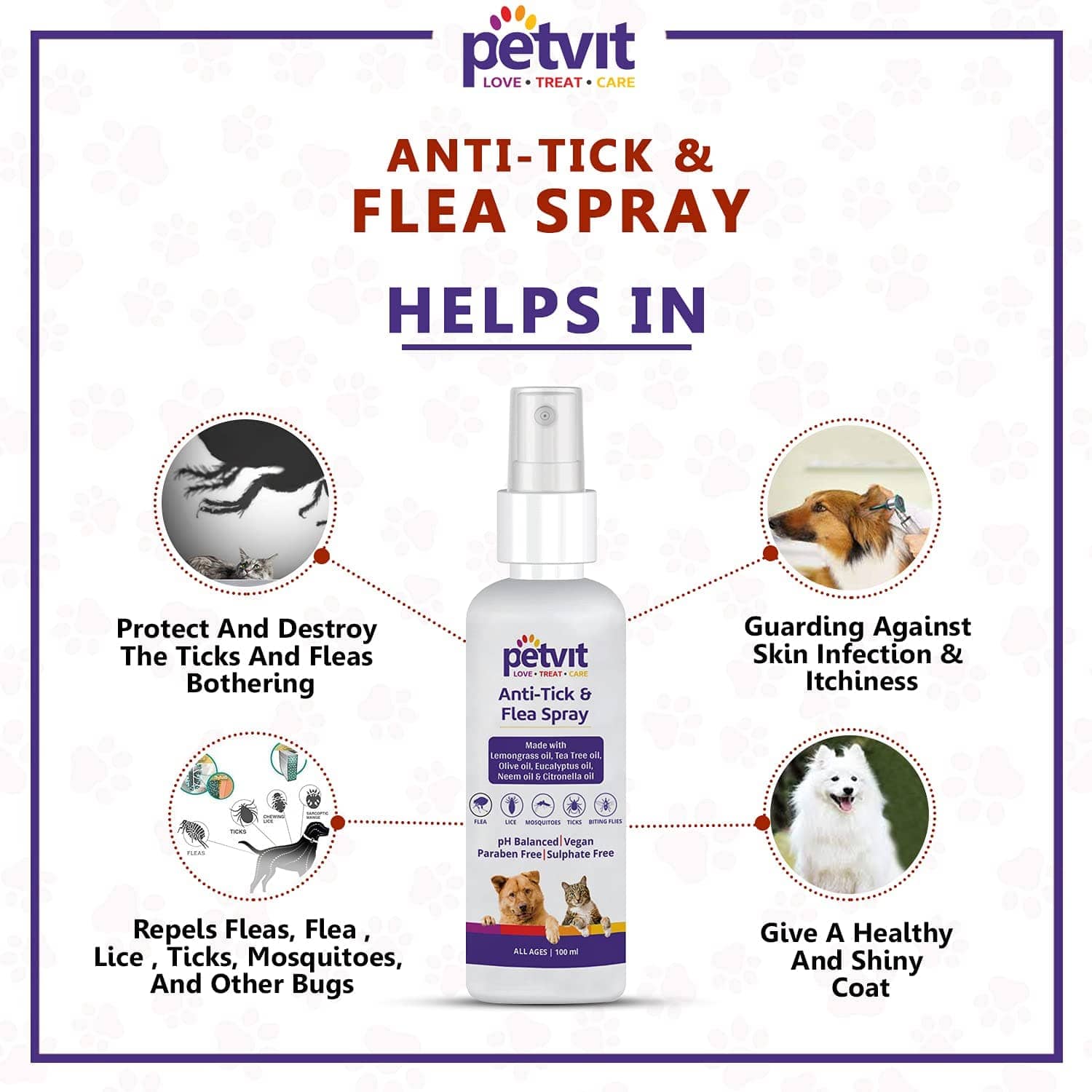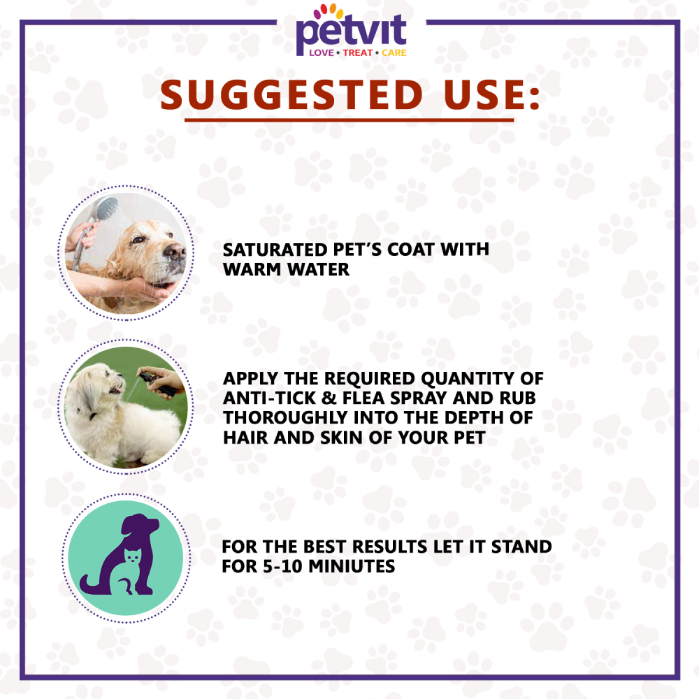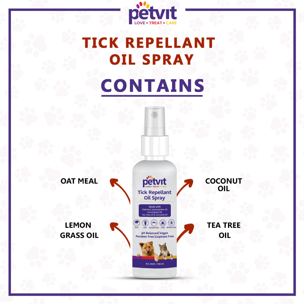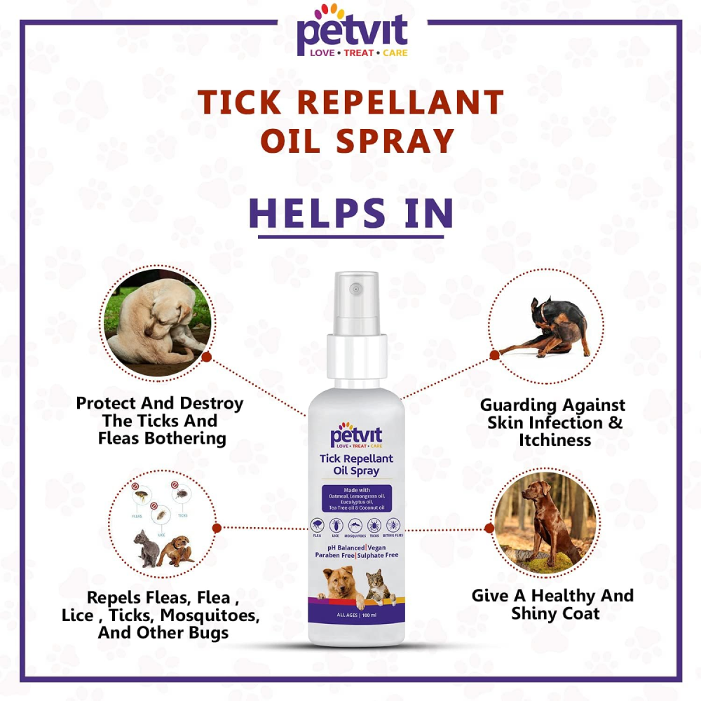 Do you hate the feeling when your dog is bothered by them? Sad when your dog is hurt? Petvit Tick Repellent oil Spray made with our signature blend of natural . Specially formulated for safe topical application to reliably prevent & repel ticks and fleas. The spray restores the natural pH level of the skin in order to give a healthy and shiny coat along with strengthening density and volume, while guarding against skin infection & itchiness. Use indoors or outdoors safe to use both indoors and outdoors, and a great option for all breeds Dogs & cats and puppies too. Petvit tick Repellent Oil is cruelty-free, talc free, toxin free, and pH balanced. effective for routine pet baths. Safe when used as directed on dogs, puppies and cats of all breeds.