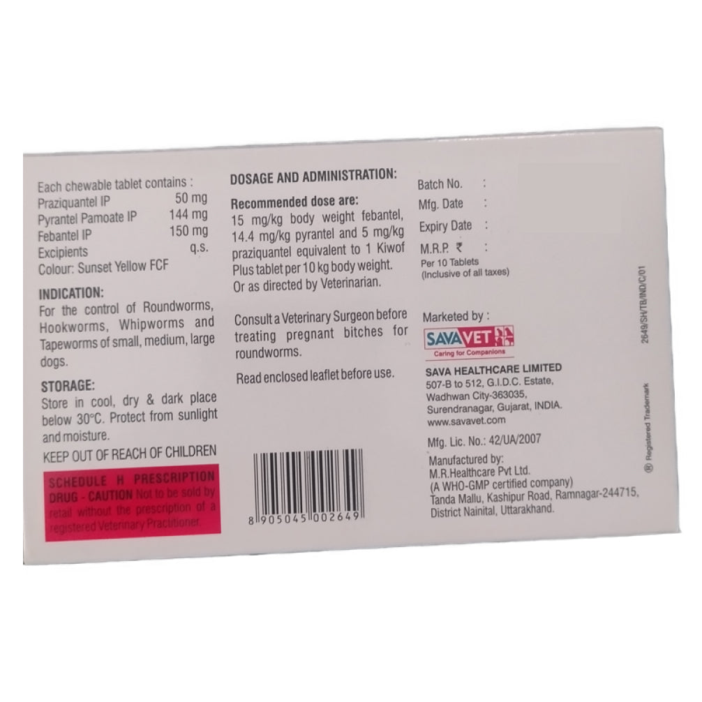 Savavet Kiwof Plus Dog Deworming Tablet is a broad-spectrum dewormer that is effective against a wide range of intestinal parasites in dogs. It is used to treat and control infections of: