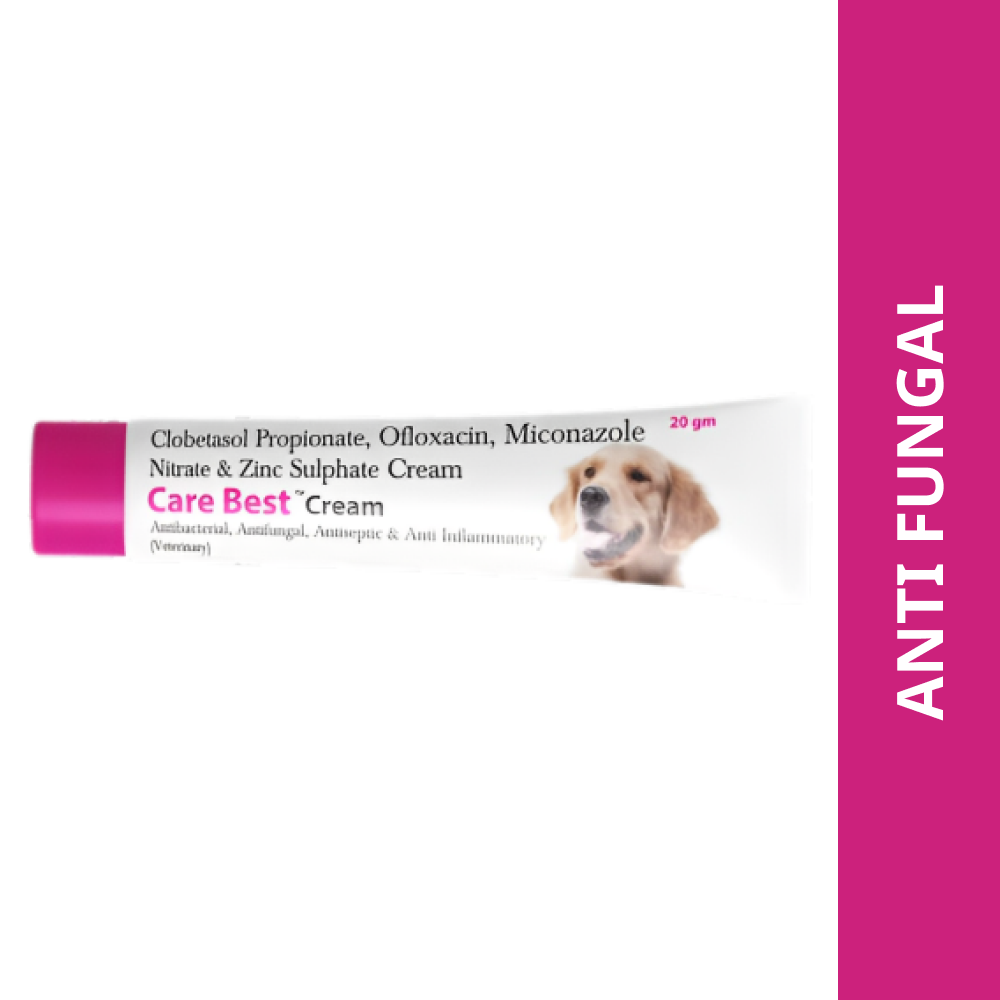 SkyEC Carebest ointment is helpful in treating yeast and fungal skin infections in dogs and cats. Miconazole inhibits the synthesis of ergosterol, a major component of the fungal cell membrane and Ofloxacin causes inhibition of bacterial topoisomerase IV and DNA gyrase. Clobetasol interferes with the inflammatory process and pruritogenic pathway by inhibiting the arachidonic acid pathway, thereby lowering itching.