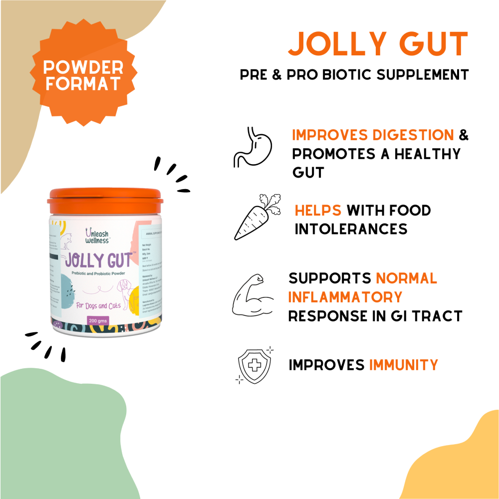 - Jolly Gut is a must-have supplement in your pet's daily diet, as the gut is the root of both good and bad health. This prebiotic and probiotic powder promotes healthy gut flora with 800 million CFU of probiotics (Saccharomyces cerevisiae, S. boulardii, Lactobacillus complex), helping to manage food intolerances, sensitive stomachs, and frequent diarrhea. Enhanced with digestive enzymes like protease, lipase, and amylase, it supports efficient food breakdown, nutrient absorption, and a strong immune system. Jolly Gut ensures your pet's digestive health is always at its best.