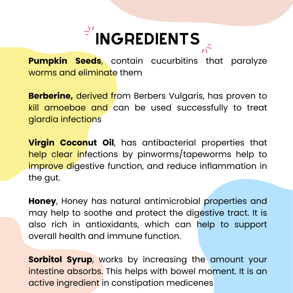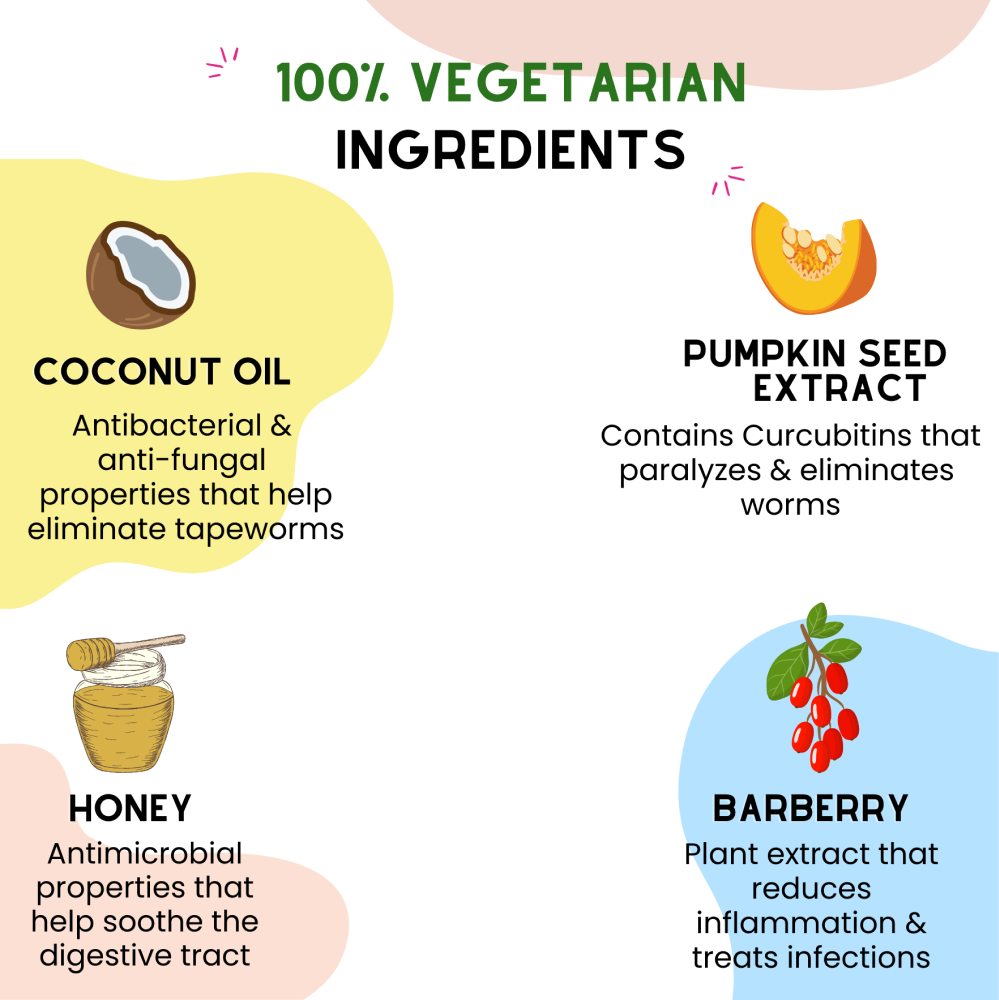 Natural Deworming: Effectively eliminates internal parasites using plant-based ingredients like papaya and pumpkin seeds, which are traditionally known for their deworming properties