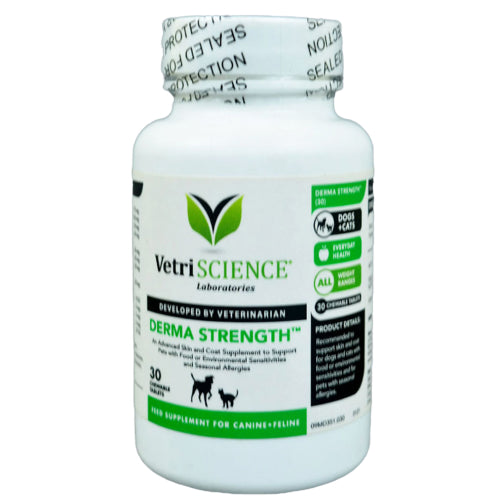 Vetri Science Derma Strength is a supplement designed to support skin and coat health in dogs and cats. It contains a blend of essential fatty acids, vitamins, and antioxidants to promote healthy skin, reduce shedding, and enhance the overall appearance of the coat.