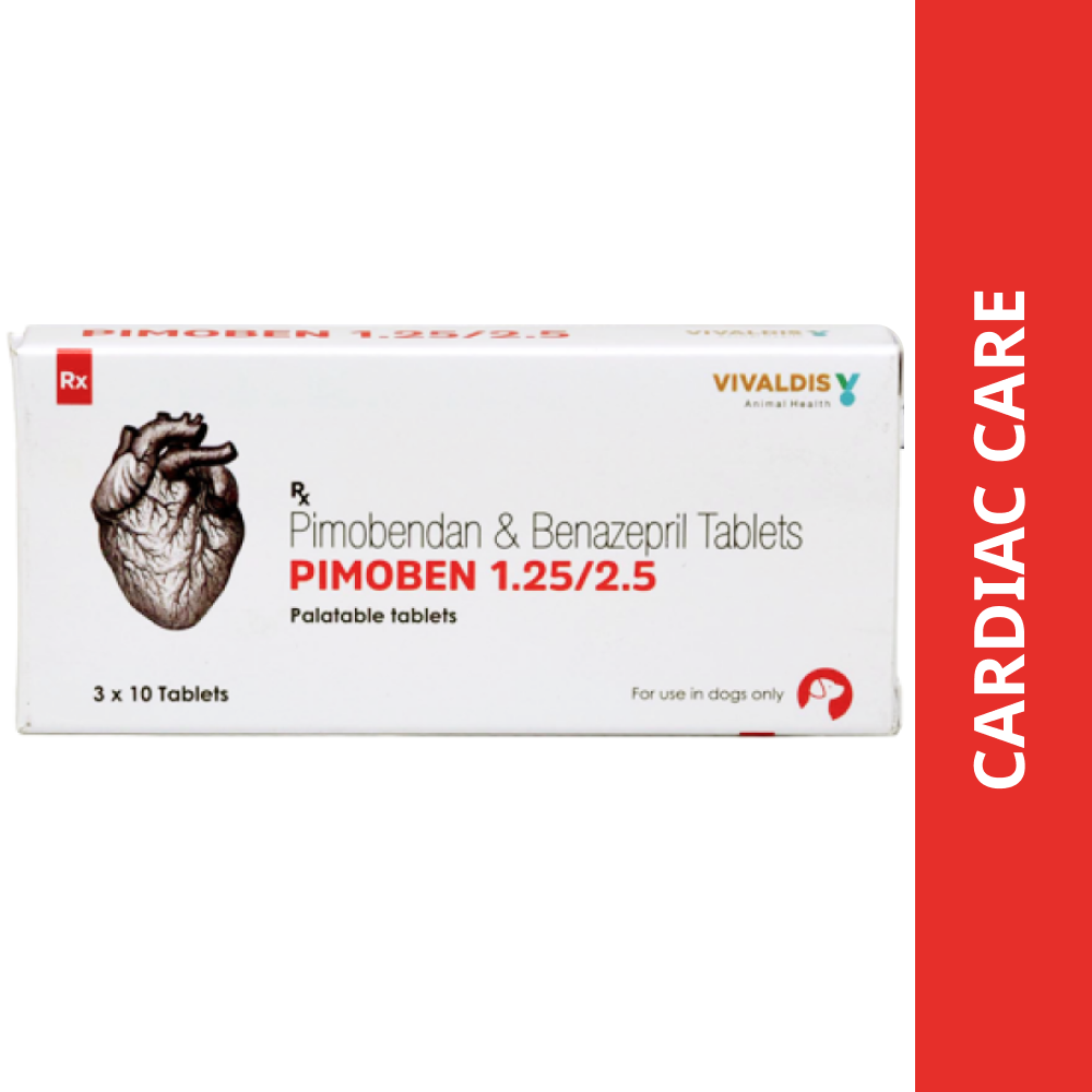 Pimoben tablets contain pimobendan and benazepril hydrochloride as active ingredients. The inotrope and ACE (angiotensin-converting enzyme) inhibitor action helps in the management of congestive heart failure. Benazepril acts on activated RAAS and reduces angiotensin II and aldosterone which prevents cardiac remodeling and slows down the progression of CHF (congestive heart failure). Reduction in sodium and water retention reduces fluid build-up and protects kidney health. Pimobendan works as a heart stimulant that moderates vasodilation with the strong vasodilation effect of benazepril. It reduces the cardiac workload. Pimobendan increases cardiac muscle contraction which increases cardiac output.