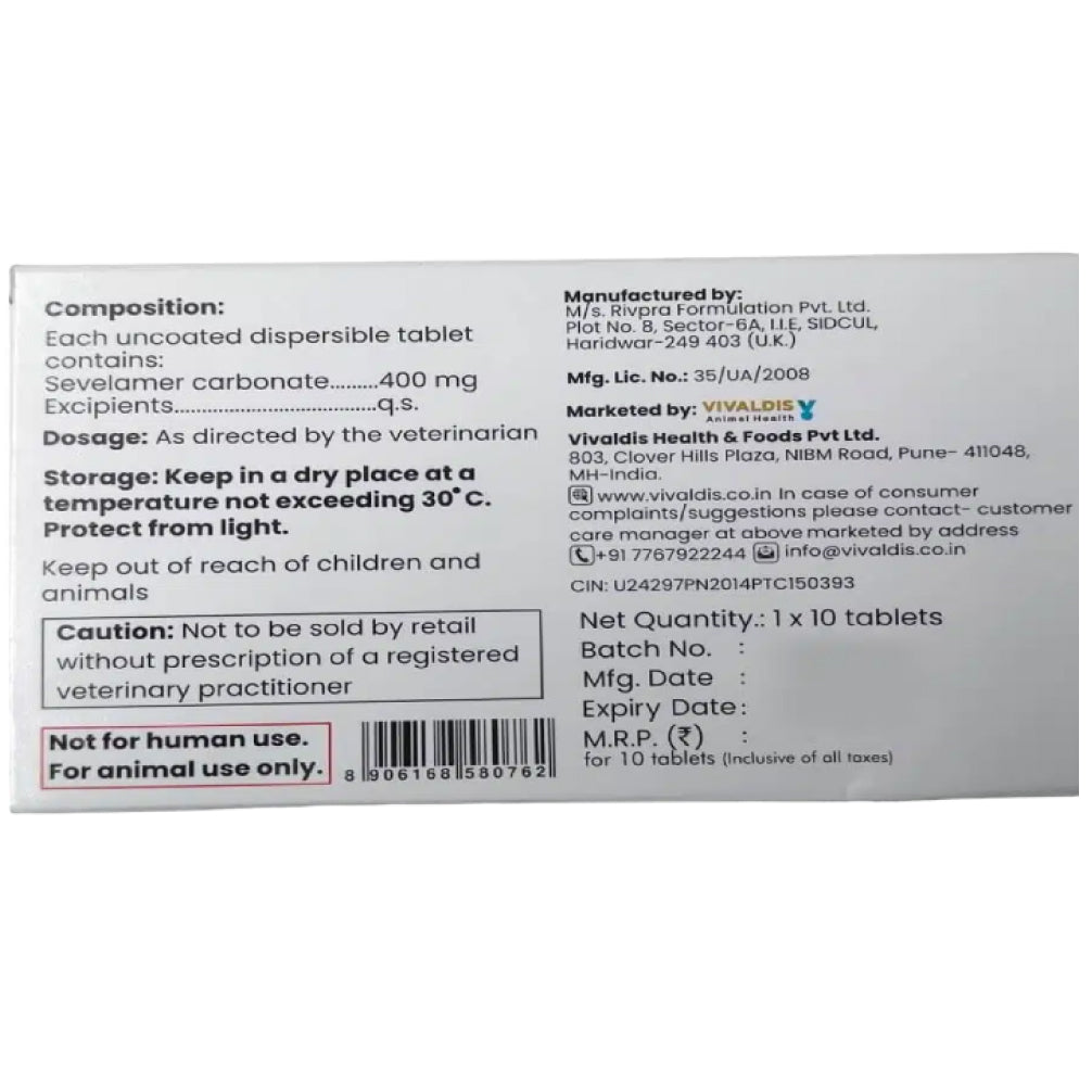 Seveclear tablets for dogs & cats is a phosphorus binder from the house of Vivaldis Animal Health. It contains sevelamer carbonate which is a calcium-free, aluminum-free, non-metal phosphate binder. Usually prescribed in cases of deteriorated kidney health in dogs & cats suffering from hyperphosphatemia. Helpful for CKD – Chronic Kidney Disease dogs & cats to remove excess phosphorus from diet.