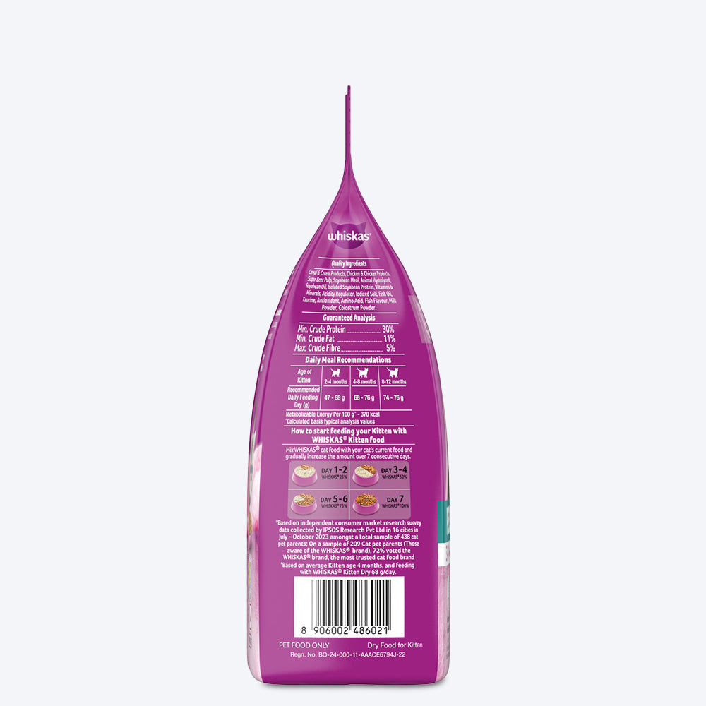 Whiskas Persian Kitten Dry Cat Food provides 100% complete & balanced nutrition, specifically designed to meet the unique needs of kitten (2-12 months) cats. A Persian cat's distinctive trait is its long and luxurious coat, due to which it is prone to several hair and skin-related concerns. This Whiskas Persian cat food provides 3-in-1 hair-related solutions for Persian cats. The essential nutrients help reduce hair fall. It's formulated with omega-6 fatty acids, zinc, biotin, and other B vitamins for a healthy skin and coat. It includes beet pulp fibre which helps support hairball control through the digestive system. With tailor-made nutrition, this cat food includes Vitamin E, an antioxidant, for a healthy immune system. It contains colostrum, a nutrient-rich goodness found in mother's milk. Whiskas is developed by experts at the Waltham Science Institute for Pet Nutrition, a world-leading authority on pet care. Please feed according to the feeding guidelines mentioned at the back of the pack. Support your kitten's growth and appeal to their taste buds with Whiskas, the most trusted cat food. All the cats and kittens prefer Whiskas...even the fussy ones!